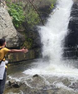 Первый, получивший имя бога грома и войны, — узким мощным потоком срывается с отвесной скалы высотой примерно 10 метров и разбивается о плоские камни внизу. Астхик, по имени богини красоты и плодородия - более плавный, порожистый, стекает по каменным ступеням, образованным скалистым склоном, в прозрачный бассейн у подножья. Водопад утопает в зелени склонившихся к потокам деревьев и кустарников.