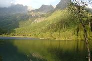 Во-первых, именно это озеро – исток бурной и яросной Мзымты. Даже около самого истока, места где вода озера изливается в узкое горло-русло, течение Мзымты значительно, а вода ледяная. В самые жаркие месяцы температура воды в Кардываче не поднимается выше 18 градусов на поверхности.