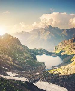 Вершины гор усыпаны снегом.