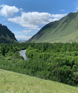 Но чем дальше мы углубляемся по древней долине — той самой, по которой в 1643 году шёл казак Курбат Иванов, — тем больше меняется пейзаж. Открывается обширное пространство, усыпанное хаотичными валунами на фоне изумрудных лугов. Кажется, будто великаны, играя, разбросали здесь каменные кегли.