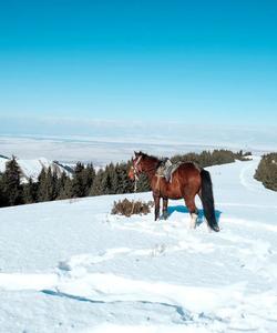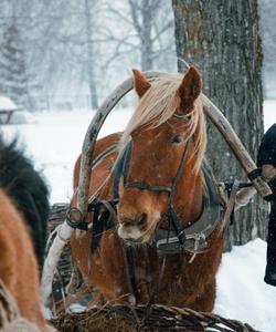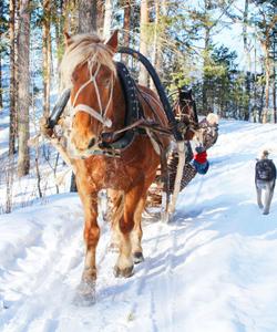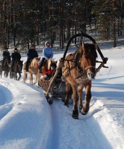 Ознакомление с упряжью. Обучение навыкам управления лошадью в санях. Ознакомительный радиальный конно-санный выезд в окрестностях села, с посещением обзорных и видовых точек (продолжительность ~ 2 часа).*