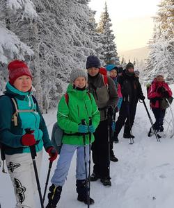 С утра идем на родник «Белый ключ» за водой, топим печь дровами и готовим вкусный завтрак, ведь впереди у нас 8-километровый переход по заснеженному лесу к центральному кордону «Таганай».