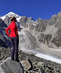 Спуск с перевала идет по леднику, поэтому здесь нам предстоит надеть кошки, системы, каски, и мы свяжемся веревкой в «связки» для безопасности. Еще один сложный участок — это сойти с ледника на морены.