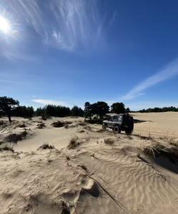 Далее едем в Кузомень в самую северную пустыню, очень атмосферное место. Сосновый лес заканчивается настоящей пустыней с песчаными дюнами. Там нас ждет переправа на другую сторону. Дожидаемся одобрения, заезжаем на понтон и переплываем устье реки.