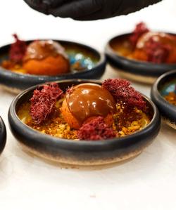 Четвертый и заключительный курс мастер-класса — сорбет из северных ягод с морошковым вареньем, чипсами из ягеля и грибной карамелью.