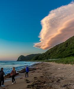На мыс мы подъедем на машинах к берегу Охотского моря, далее предстоит треккинг по песчаному пляжу примерно 40 мин.