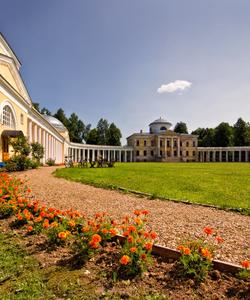 Внешний осмотр усадьбы Знаменское-Раёк. Мы сделаем небольшую остановку около прекрасной усадьбы, построенной в XVIII веке по проекту архитектора Н.А. Львова. Архитектурный ансамбль усадьбы включает господский дом и круговую колоннаду, соединяющую его с боковыми флигелями, и стоящими напротив парадными воротами.
