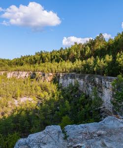 А в самом сердце Дюкинского заповедника мы посетим уголок «альпийских скал» — Дюки, как называют их местные жители. Огромные отвесные скалы, высотой свыше 13 метров, со всех сторон окружены мачтовыми соснами и поросли сосновым молодняком. Трудно поверить, глядя с высоты отвесной скалы на глубокий протяжённый каньон, что мы находимся в средней полосе России.