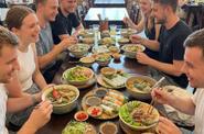 Обед — сытный и понятный: микс вьетнамской и европейской кухни, мясо, рыба, супы, салаты, рис, напитки и вино. Ровно то, что нужно после такого дня.